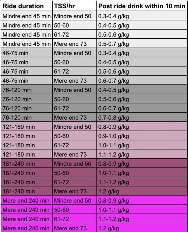 Jeg så for nylig en video med Jesse Coyle, som er den ene del af The Nero Show på Youtube. Han er også cykeltræner, og havde en video der hed noget ala "7 mistakes that are causing you gains". Mange af tingene har jeg allerede styr på, men han kom ind på vigtigheden i at indtage kulhydrater LIGE efter træning. Altså inden for de første 10 minutter af endt træning. Han havde lavet et skema så man relativt hurtigt kunne gennemskue hvor mange gram kulhydrat man skal have ind, og det er altså nogle ret solide mængder. Jeg screenshottede hans skema, det opfordrede han faktisk til, og lavede mit eget skema. Min træning i går var i 121-180 min kategorien, og min samlede TSS var 168. Det krævede lige lidt tankevirksomhed med 2 timer og 20 minutters træning, men nåede frem til at det måtte være det samme som 8x 20 minutter. Så dividere 168 med 8 og så gange med 3 for at få en time - 72 TSS i timen. Så ca. 90 gram kulhydrat efter træning. Det blev til en 45 grams gel, en dåsecola, og så 15 vingummibamser (Haribo har regnet den ud, og hver vingummibamse indeholder ca. 1 gram kulhydrat ). Fordelen ved at gøre det på den måde skulle være at man får fyldt depoterne op umiddelbart efter træning, som gør at man er klar til træningen dagen efter. Derudover gør den ekstreme mængde sukker på meget kort tid, at man ikke har de vilde cravings efterfølgende.