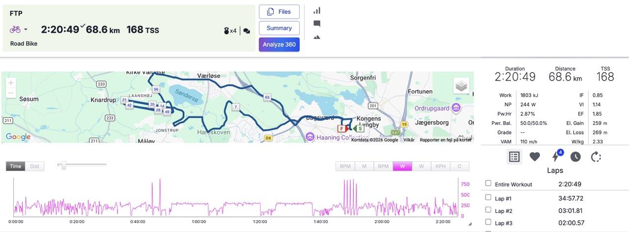 Klokkede tidligt ud fra arbejde for at komme ud og nyde solskinsvejret. Var alt for optimistisk ift. påklædningen, for vinden var markant koldere end jeg havde vurderet. Kørte ud til Flyvestationen, kørte lidt opvarmning, og så stod den ellers på 3x12 minutter lige under FTP. Som tidligere nævnt mistænker jeg min Tacx Neo for at måle lidt lavere end både min Quarq og Magene wattmåler, så jeg lagde 10 watt oveni tallene i dag. 1. interval - 283 watt 2. interval - 289 watt 3. interval - 289 watt Jeg valgte også lige at køre 5x 6/54 efterfølgende inden jeg vendte snuden hjemad. I alt blev det til 2 timer og 20 minutter med 214 watt i snit.