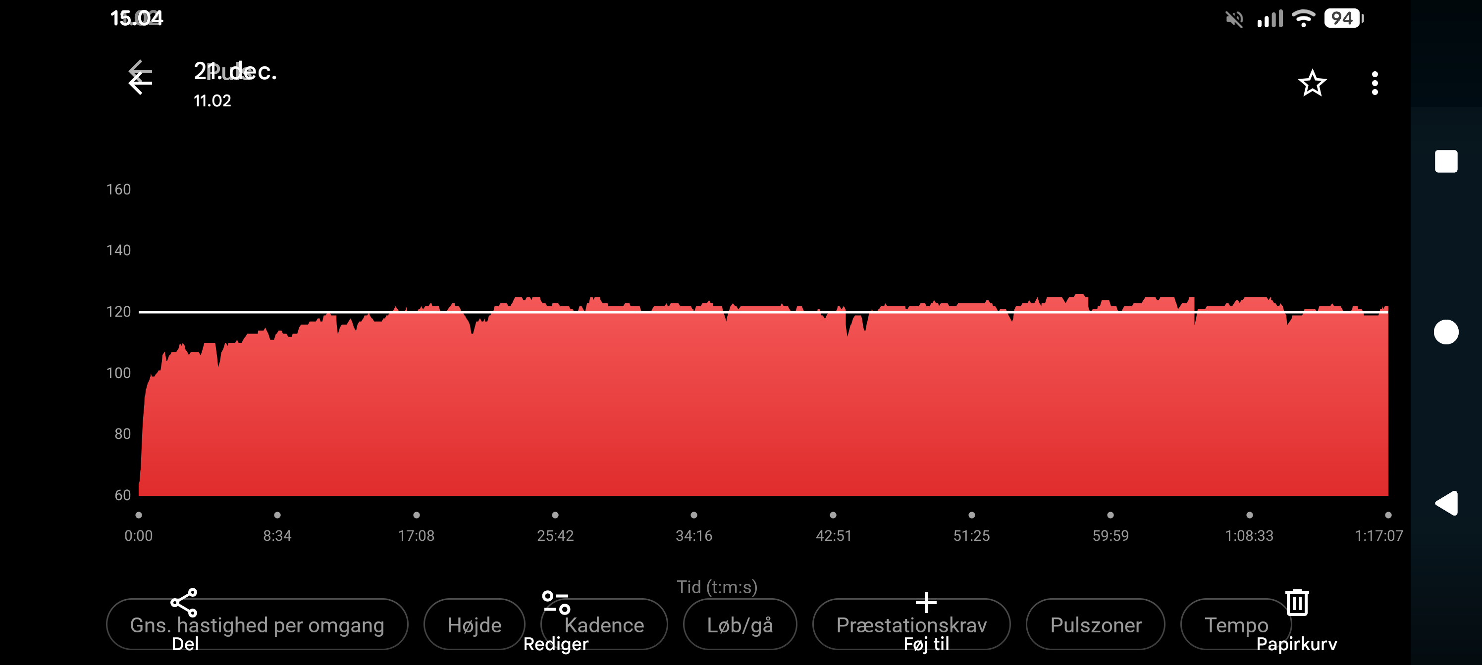 Fornuftig træningsuge, dog med 2 løbefrie dage pga. almindelig travlhed. Intervaller onsdag. Tur i Puregym lørdag inkl. det sædvanlige progressive kvarters løb på løbebånd. I dag, søndag, hævede jeg barren lidt med en 14 km-tur ned omkring Valbyparken. Havde en lumsk plan om et tempo under 5:30, men den endte på 5:35 i snit, hvad der også er godkendt. Stadig ingen atrieflimren, så jeg er åbenbart ved at løbe fra den. Glad for at kunne løbe op til 14 km relativt afslappet. Har nemlig to gode 14 km-ture herfra. Den ene som i dag langs Harrestrup Å ned til Valbyparken og rundt om den. Den anden langs Damhussøen og -engen videre til Kagsmosen og rundt om den. Begge er det helt pivflade ruter med meget få afbrydelser, så man kan løbe nogle tempointervaller og noget fartleg på dem. Og det er vist egentlig en rum tid siden, jeg har løbet så langt. Og NEJ, der er ingen planer om hverken hel- eller halvmaraton. Med distancer mellem 3-15 km plus/minus har jeg et rigtig godt spænd til de forskellige slags gak og løjer, jeg forsøger mig med. Som nævnt heller ingen flimren i dag, hvor pulsen (mildest talt) lå meget ensartet fra start til slut.