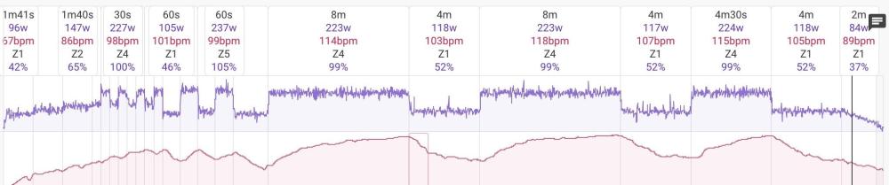 Gregers TF Posted March 8, 2014 Author Report Share Posted March 8, 2014 (edited) Næsten efter planen, kom jeg på hjemmetræneren for en lidt mere jævn tur en sidst, for at se om der er udfald i wattmålingerne.Jøsses, hvor var det dog kedelig og da min bagdel efterhånden havde sovet et stykke tid, stoppede jeg eksperimentet før tid, da jeg havde brug for at køre stående men så ville jeg ikke kunne køre helt jævnt længere..I der kører med wattmåler, må meget gerne byde ind på, om jeg skal have skidtet til rep, eller om alt er inden for det forventelige. Jeg kørte med wattbestilling på tacxen for at minimere de udsving der naturligvis må være.Selv synes jeg, det ser forkert ud med de halvperiodiske fald der er i effektkurven i den sidste blok, som jeg havde forventet havde været næsten flad: Edited March 8, 2014 by Gregers TF Quote Link to comment Share on other sites More sharing options...